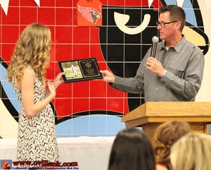 | Junior Ellen Thomas received a plaque (from Coach Arlin Stacy) recognizing her (repeat) All-State status by a top 10 finish at the state meet Nov. 1st. That qualified her for the All-Star event with the top Oklahoma XC girls from all the classes competing together at Edmond Nov. 8th (see status below). |