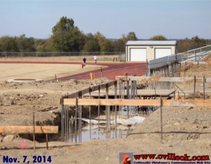 | When I took this photo Friday Nov. 7th to show the new footings west of the high school (for the new gym and commons), I was not thinking about cross country. I did line up the shot with the track in the back ground just to help show the location. It wasn't until I got the photo up full sized on my computer screen that I realized the person on the track was Ellen Thomas. She was preparing for the All-Star meet the following day. -- Ted |