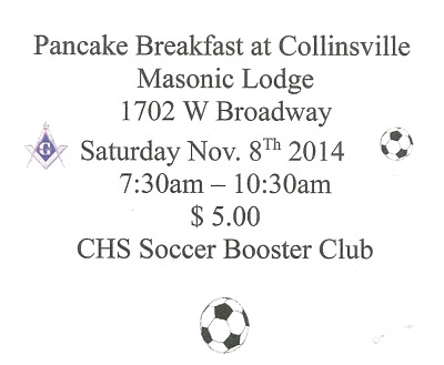 | Pancake Breakfast Saturday Nov 8th 2014 7:30 - 10:30 am @ Collinsville Masonic Lodge 1702 W. Broadway Tickets $5 or pay @ door. Proceeds benefit the CHS Soccer Booster Club -- 11/3/2014 |