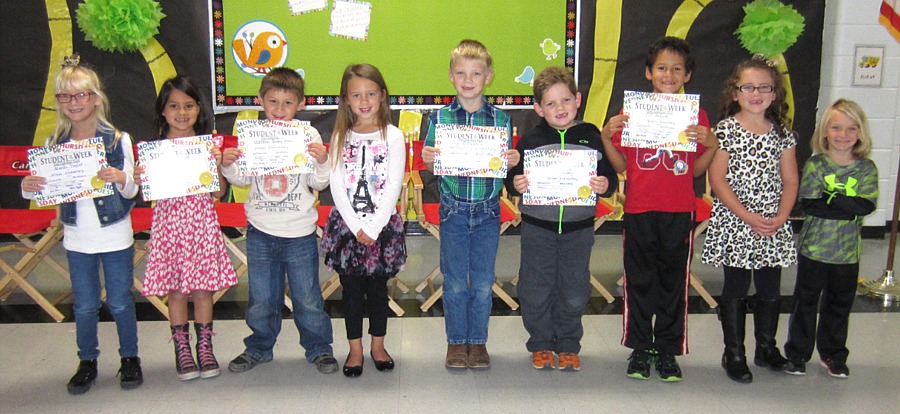 | First Grade -- Marlie Taylor, Izabella John, Cliffton Risley-Mata, Kynlee Vilarreal, Ty Branen, Sam Causey, TJ (Thomas) Sullivan, Raeghan Rogers, and Isaac Fisher |