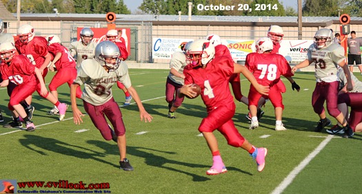 | 7th Grade QB Caleb Mitchell (#4) faked a handoff and then circled around left end for the only touchdown of the game at 4:25 in the 2nd quarter against Kelleyville here Monday. The play covered about 13 yards. Colton Mosier ran in the extra point. |