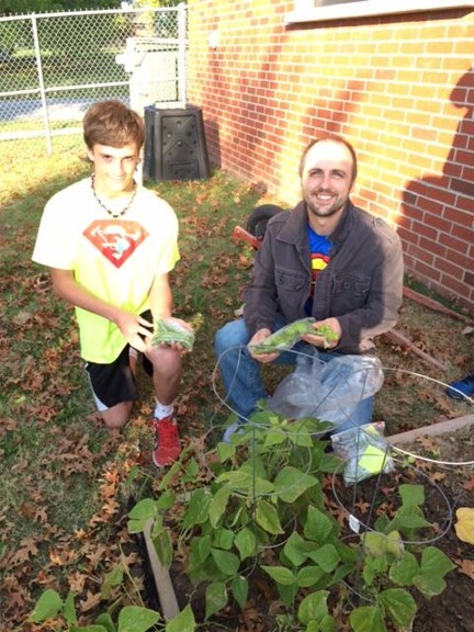 | Hayden Knight and Mr, Tow harvesting green beans and lettuce in the Middle School Quad as a part of a Life Skills class project. -- Ronnie Tow (10/31/2014) |