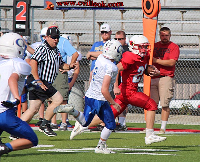 | Taylor Olinghouse (#12) intercepted this Oologah pass near the Oologah 30 yard line on the final play of the first quarter and returned it to near the 10 yard line. | ||||||