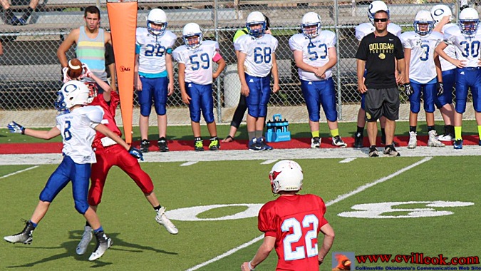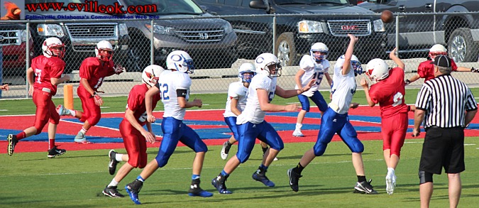 | This Cole Dugger (#8) pass attempt was incomplete and the Collinsville 7th graders turned the ball over on downs at the 6 yard line early in the 2nd quarter. The score remained 22-0 until Oologah barely avoided a sack attempt and completed a 30+ yard TD pass with 2:15 left in the game. | ||||||