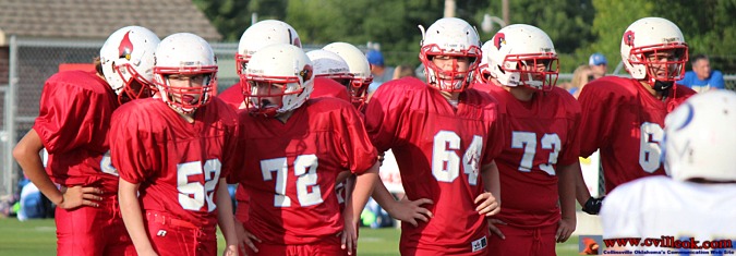 Football Jr. High Update 9-2-14 The Collinsville Cardinal Jr. High Football teams hosted the Oologah Mustangs Tuesday night at Sallee Field for a non-conference contest. The Mustangs galloped into town and after all the dust had cleared the Cardinals had roped and corralled the Mustangs and sent them back to Oologah in a slow walk. The 7th grade Cardinals displayed total control the entire night. With an outstanding kicking game, dominate running game, precise passing attack and smash mouth defense the Cardinals were too much for the Mustangs. Cardinals win 22-6. No injuries were reported. The 8th grade Cardinals gave the fans plenty of entertainment. With a crushing running attack, overpowering defense and outstanding kicking game the Cardinals broke the Mustangs will to play. Cardinals win 22-0. No injuries were reported. In the 9th grade contest the Boys of Fall proved what Cardinal Football is all about. The slugfest was just that; a typical hard hitting, smash mouth affair. The Cardinals played every down with tenacity and with just 6 seconds left in the rivalry score to win 13-12. No injuries were reported. The Cardinals next action will be on September 11 at Claremore for the first Metro Lakes Conference game of the season. The 6A opponent will be a tough battle; so we need the Cardinal Nation to come support our teams. Games begin at 5pm. Coachm up |