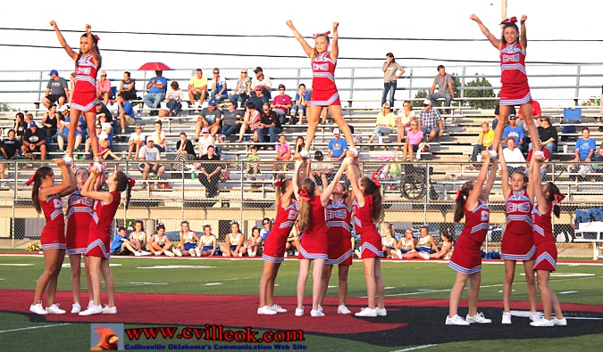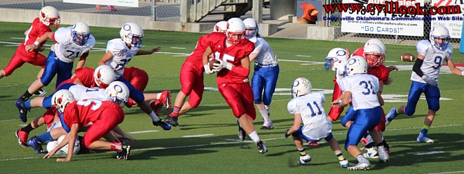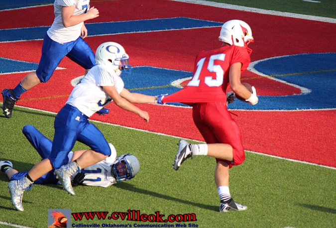 | On the first play from scrimmage Grayson Boomer (#15) took the handoff and ran 67 yards for a Collinsville 8th grade touchdown against Oologah here Tuesday Sept. 2nd. The extra point attempt was blocked and the score was 6-0 at 7:31 in the 1st quarter. | ||||||