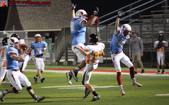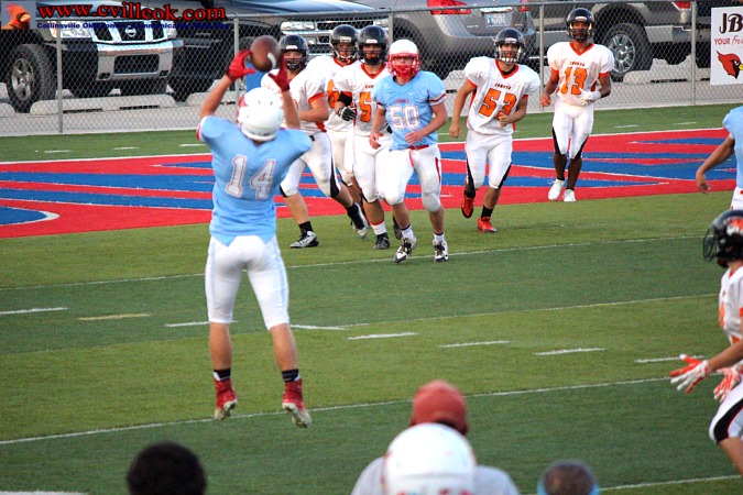 | The Collinsville defenders came very close to trapping Coweta's QB in the endzone for a safety ... but he escaped which turned out OK as he then threw a pass which Justin Prather (#14) picked off near the 20 yard line and returned for the first score of the game with 3.3 seconds left in the first quarter. Cole Hadley kicked the extra point for a 7-0 score. | ||||||