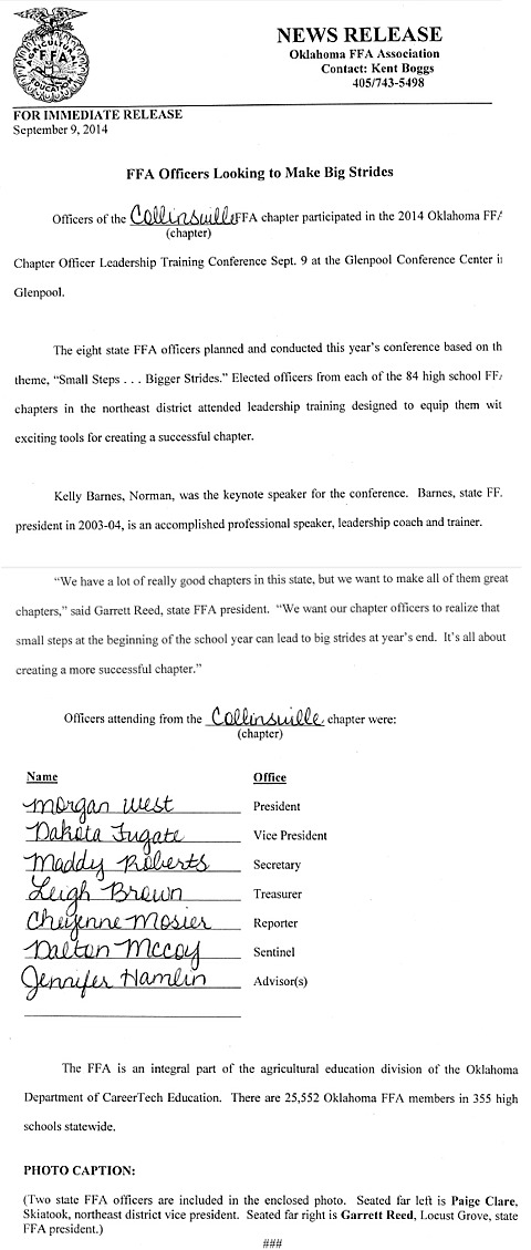 FFA President), and Paige Clare (NE District VP from Skiatook). Standing (L-R): Jennifer Hamlin (Collinsville FFA Advisor), Maddy Roberts (Secretary), Dalton McCoy (Sentinel), Leigh Brown (Treasurer), Dakota Fugate (Vice President), and Cheyenne Mosier (Reporter). |