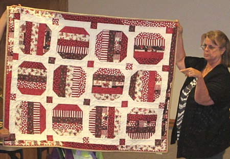 Patti Schneider displayed her completed quilt, made from red and white strips - a current favorite method of patchwork design. |