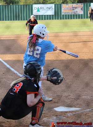 | Darci Chester (#22) had singles in the 1st, 3rd, 5th and 7th innings but the other Lady Cards had less success against Coweta's pitcher. Darci loaded up the bases later in this at-bat in the 3rd. |