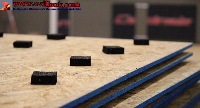 | This is the plywood subsurface that is being installed at the Upper Elementary gym prior to the final Maple wood playing surface. The photo below shows the underside of the plywood with spaced rubber cushions providing just a small amount of "give" to the floor. | ||||||