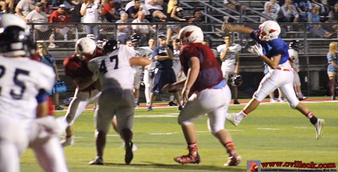 | Seth Boomer had scrambled near the sideline before tossing this TD pass to the waving receiver in the endzone in the scrimage here Friday evening against Bartlesville here Friday August 21, 2015. | |||||||||