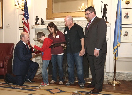 Sen. Rick Brinkley presents Gold Star Medal to Sgt. Anthony Petersons son and parents. (Left to right) Sen. Rick Brinkley, Dakota Peterson, Terra Peterson, Garth Peterson, and Rep. David Derby. |