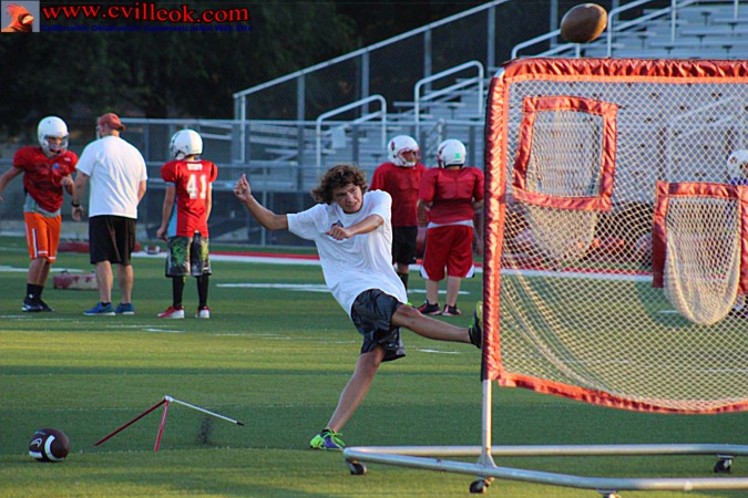 CHS Sophomore Cole Hadley was working on his field goal and extra point kicking Friday night during the elementary kids camp. The passing accuracy practice net was serving as the defensive line to force extra height. | ||||||||||||||||||||||