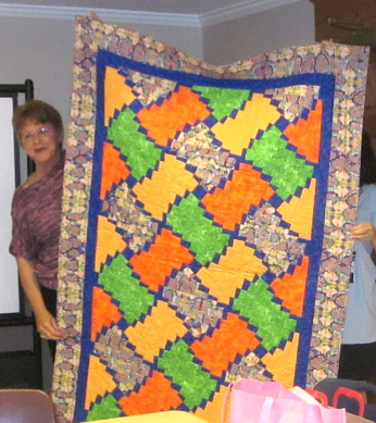 Jackie King peeks over the top of a recently completed quilt (above), and Chris Pierce displays a finished quilt (below), that was started at the group's Spring Retreat. |