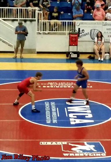 Wyatt Jordan beat Norman North's Jake Thorton 6-0 in the OCA All State Wrestling match Weds night at Sapulpa. -- JIm Riley 7/29/2015 |