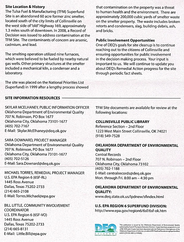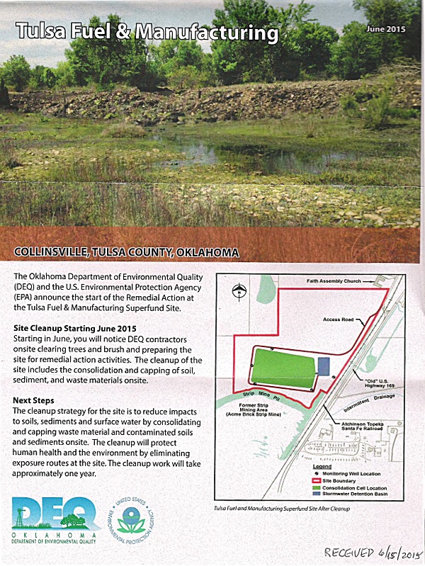 DEQ Letter Says Remediation At Former "Tulsa Fuel & Manfacturing" Smelter Site In Collinsville Starts In June 2015