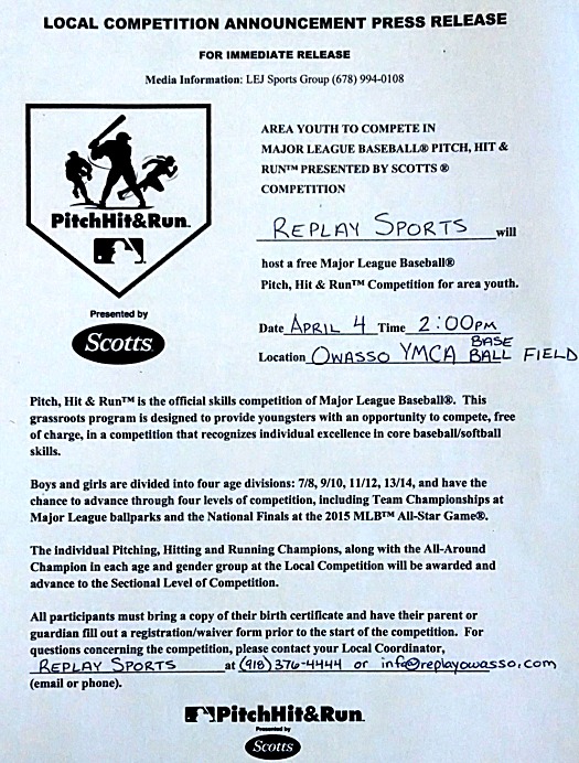 I don't know if this is something you would be interested in covering, or helping to spread the word, but my business, Replay Sports, is hosting a Major League Baseball Pitch, Hit and Run competition next month. This FREE competition is designed to give kids an opportunity to compete in a competition that recognizes individual excellence in core baseball/softball skills. The competition is open to boys and girls ages 7-14.