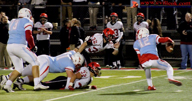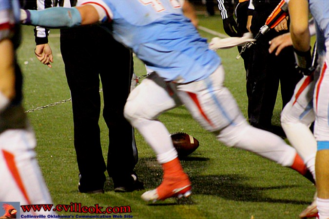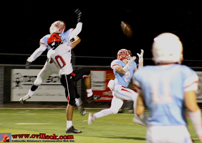 | Sheaffer Smith (#25) stretched to haul in this Boomer pass to mid-field but had the ball knocked loose at the BK 42 yard line with 1:42 left in the 1st quarter to end Collinsville's third possession. | |||||||||