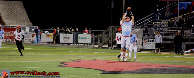 | Collinsville second possession started after a Bishop Kelley punt to Collinsville's 45 yard line. Seth Boomer's pass to Brett Erickson reached the 41 and was followed by a Marcus Tillman run to the 13 yard line. Boomer's 13 yard pass (above) to Levi Draper (below) resulted in the second quick Cardinal score. | |||||||||