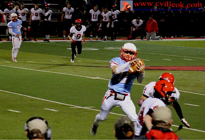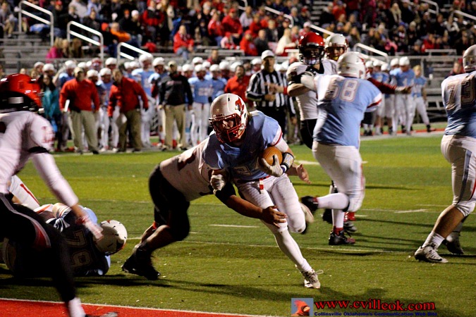 | On Collinsville first possession (following a Bishop Kelley punt to the Cardinal 30) Seth Boomer kept to the Cards 48 followed by a 52 yard TD scamper up the middle by Sheaffer Smith (above). | |||||||||