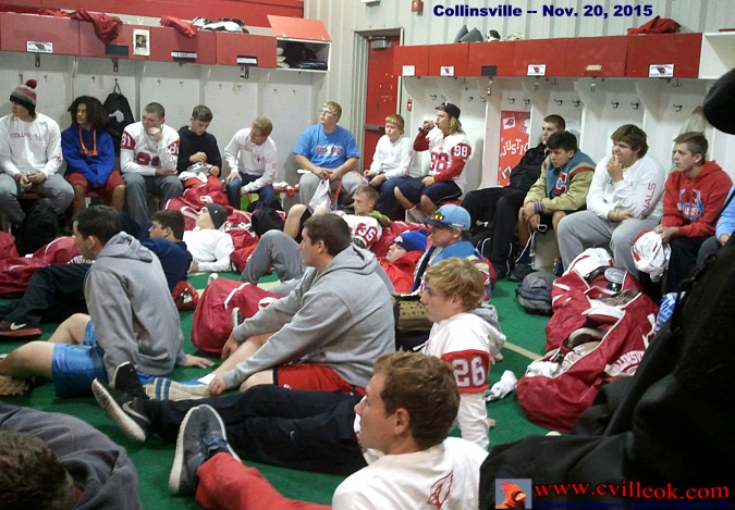 | The Collinsville varsity football team started the long day Friday morning in the Collinsville locker room as they gathered their equipment before boarding two charter busses to Lawton for a second round 5A playoff game. The coaches went over specific game situations and sent the players off with the message that "we are not going to play cautious ... we are going to take changes ... and take the game to them." | ||||||||