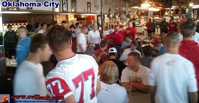 | Lunch was served at an Oklahoma City steak house about 1:30pm ... after munching on snacks provided by the boosters to start the trip (and Subway sandwiches on the bus for the happy return trip). | ||||||||