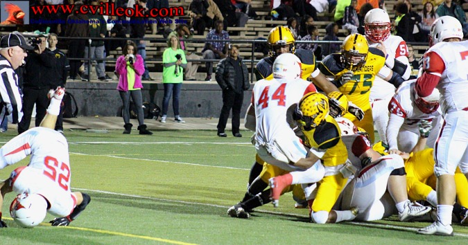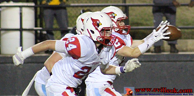 | Levi Draper (#10) made this tackle and forced a fumble recovered by Collinsville (below) at the Cardinal 9 yard line with 1:14 left in the first quarter. | ||||||||