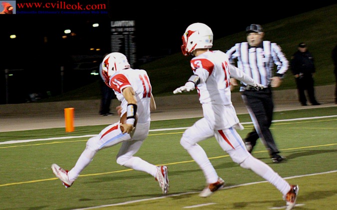 | QB Seth Boomer (#12) ... with a Nathan Schaffner (#58) block on this play ... didn't hit every receiver but burned the Lawton Mac secondary on plenty of occasions during an outstanding offensive performance. The defense and special teams had outstanding games also. | ||||||||