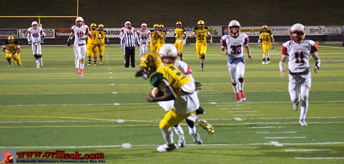 | Lawton Mac scored early in the 4th quarter (44-21) and followed with a successful onside kick and nearly scored again (above) with Tyler Forrest (#1) making a saving tackle near the 1 yard line. Forrest completed the "save" with an interception below. | ||||||||
