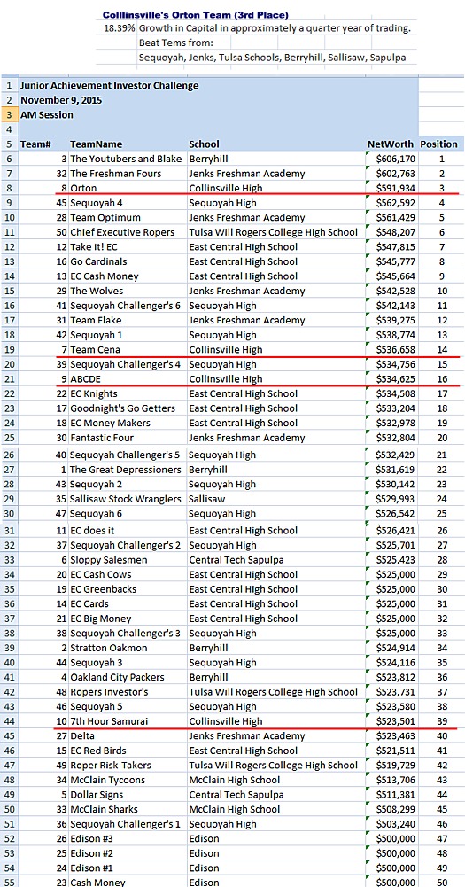 Monday Nov. 9, 2015 the four students named and appearing in an attached photo competed successfully at the Junior Achievement Investor Challenge. -- James Allison |