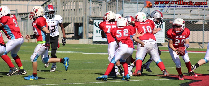 | Already leading 6-7 Union drove to the Cards two yard line before Tristan Cottingim (#44) covered this Union fumble early in the 4th quarter. | |||||||||||||||