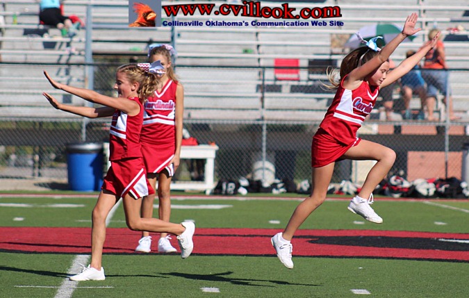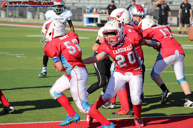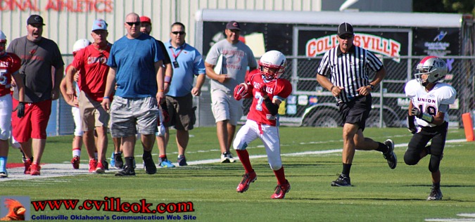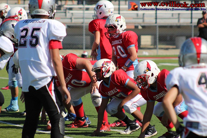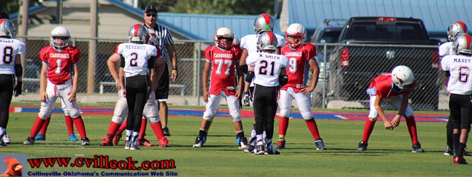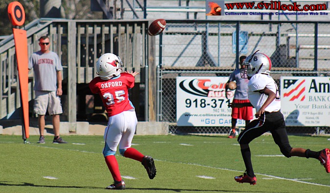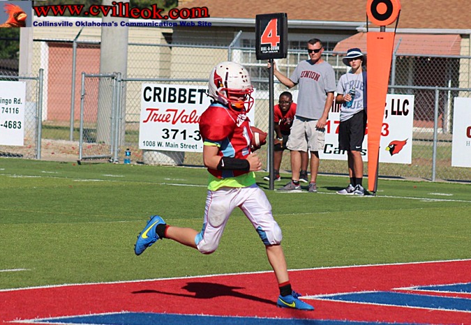 | Andrew Carney (#18) scored Collinsville's only points on this 8 yard TD pass from Landon Bunch at 42 seconds before half time. The kick failed and the Collinsville 6th graders led 6-0 at the half. | |||||||||||||||