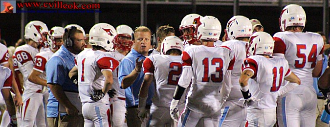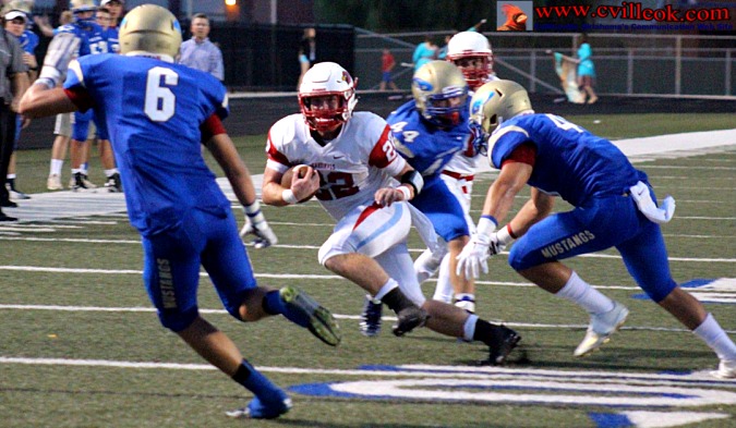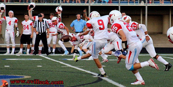 | Cole Hadley (#9) kicked off the first game of the season and the Cardinals got a quick wake up call as the Mustangs returned it to the Collinsville 15 yard line. | ||||