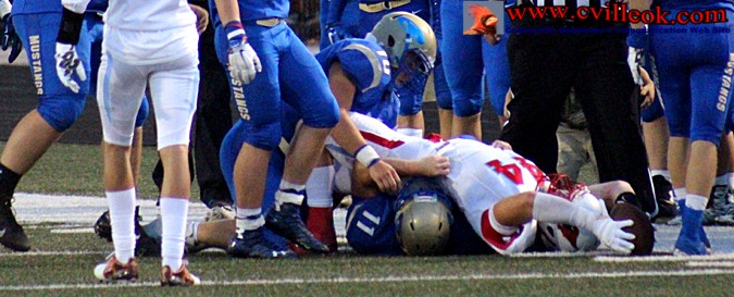 | Collinsville stopped the Mustangs short of the goal line on 4th down and took over at their own two yard line at the 10:22 mark of the first quarter. | ||||