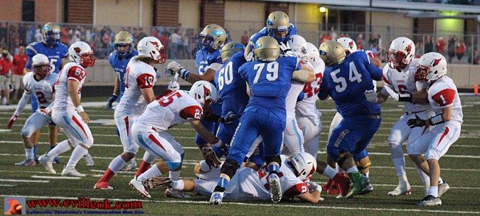 | Levi Draper (#10), Josh Arnold (#43), and Bradley Smith (#73) stopped this play near the 3 yard line in Oologah's short opening drive. | ||||