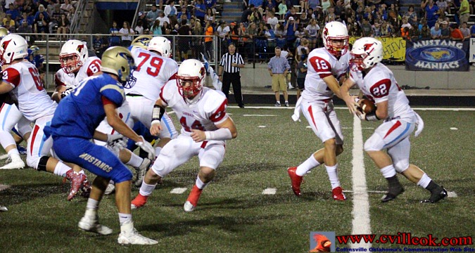 | Oologah went up 10-24 with 1:05 left in the 3rd quarter on a 78 yard drive. A short kickoff gave Collinsville the ball at their own 44. Marcus Tillman (#24) carried the ball into Oologah territory with the handoff from Seth Boomer (#12) and blocks by Colin Ford (#62) and Jackson Wilson (#61) late in the 3rd quarter. | ||||