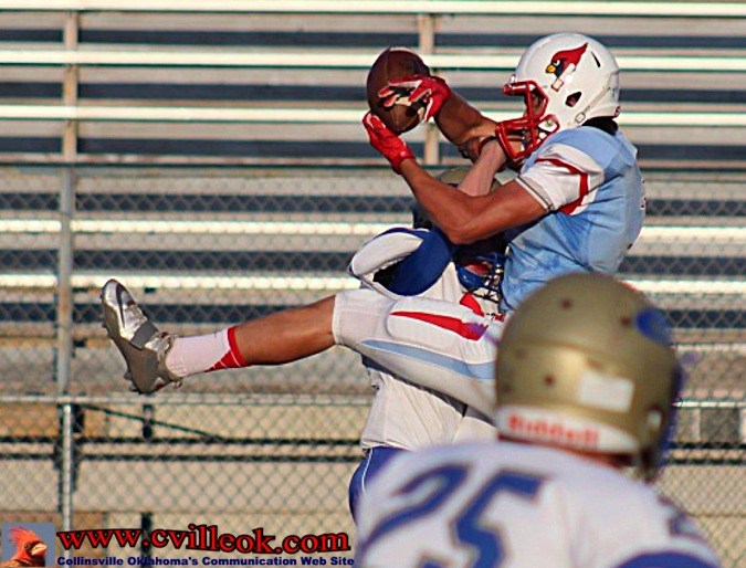 | Logan Sieminskie (#20) scored the first touchdown for the Cardinal JV here Monday -vs- Oologah at 6:09 in the first quarter. Sieminiske had started the opening drive by carrying the kickoff back into Oologah territory. | |||||