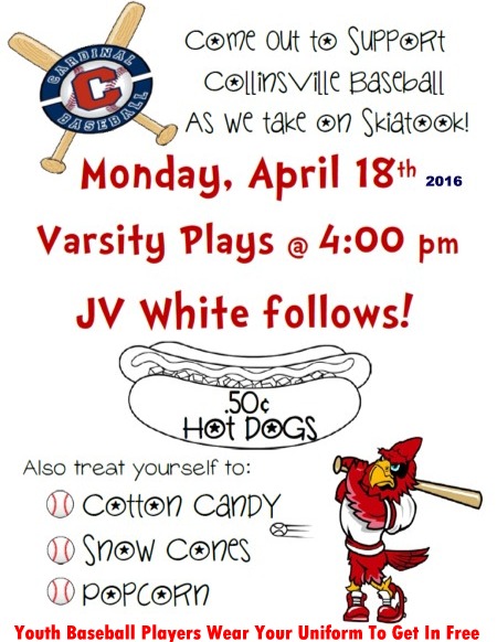 April 228am Boys Tennis at Duncan CHS Seniors Cap & Gown Photos 1:30 Collinsville HS Track Meet tba CHS Baseball at McAlester Tourn. 4:30/6/8pm CHS Soccer here -vs- Pryor (Cardinal TV) -- SR Nite |