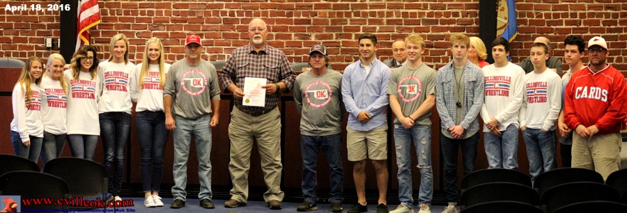 City Commission 1. Call to Order. 2. Invocation. 3. Flag Salute. 4. Roll Call. -- (Absent: Garrett) & (Present: Shafer, York, Bateman and Francis) 5. Presentation of Proclamation to Collinsville Wrestling Team. -- A city proclamation was read in honor of the 6-time state champion CHS Wrestling Team (Prev. Coverage) -- Photo above right ... with the Mat maids, coaches and part of the championship team. 6. Consideration and possible action relating to a request for Commission approval of the Consent Agenda. All matters listed under Consent are considered to be routine and will be enacted by one motion. Any Commissioner may, however, remove an item from the Consent Agenda by request. A motion to adopt the Consent Agenda is non-debatable. --A.