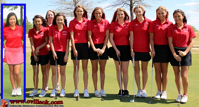 2016 CHS Girls Golf Team -- L-R: Nina Lee (inset photo from 2015), Destiny Unger, Coach Toni Slagle Herriman (in back), Alayna Calloway, Bryn Willt, Gail Young, Remy Young, Madison O'Dell, Sophie Sallee, & Caroline Blevins. | ||||