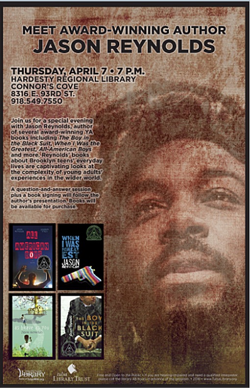 Teen Team applications are available now through May 1st at all TCCL locations and on the librarys website for teens at http://teens.tulsalibrary.org/tccl/teen-team. Teens interested in applying must return their completed applications to the library where they want to work during the summer. MEET AWARD-WINNING AUTHOR JASON REYNOLDS THURSDAY, APRIL 7 7 P.M. HARDESTY REGIONAL LIBRARY CONNORS COVE 8316 E. 93RD ST. 918.549.7550. For more information visit our website at http://www.tulsalibrary.org/sites/default/files/homeblocks/HR_author-jason-reynolds-event-poster_16_sm.pdf Thanks, Robin Bushyhead (3/29/2016) |
