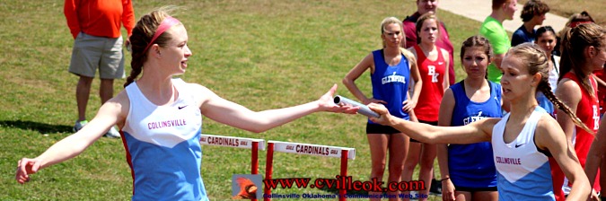 | Chandler Cole and Levi Draper are already synched up in stride before Levi reached back for the baton in a relay race in Friday's HS track meet hosted by Collinsville. | ||||
