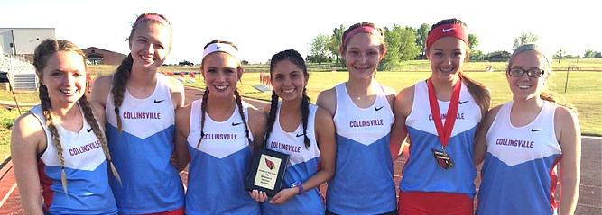 | A few members of the Collinsville High School Track Team pose with the Girls 2nd place plaque after the Collinsville hosted event here Friday April 22, 2016. -- Submitted Photo | ||||
