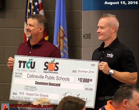 The Tulsa Teachers Credit Union (TTCU) has donated a million dollars to area schools recently. Collinsville's portion of that amount (based on student enrollment) was $15,000. Another $2,000 was added from the TTCU card swipe program bringing the total to $17,000. That check was presented to Collinsville School Superintendent Lance West (left) by a TTCU representative August 15, 2016 as the teachers and staff gathered for a professional development before classes started on the 18th. |