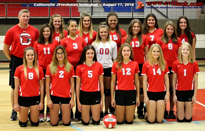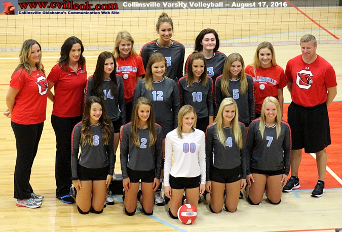 2016 Collinsville HS Varsity Volleyball -- (L-R) Front Row: Annie Haught (6), Bryn Willt (2), Maddy Roberts (00), Ashley Flanagan (4), and Kailynn Wheeler (7). -- Middle Row: Head Coach Ashley Maritz, Coach Jennie Hagen, Kylie Enloe (14), Shae Thomas (12), Gracie Haught (10), Keri Smith (5), Regan Brewer, and Coach Ryan Chritian. -- Back Row: Katy Smith, Mallory Vaughn (13) and Megan Rice (3). | ||||