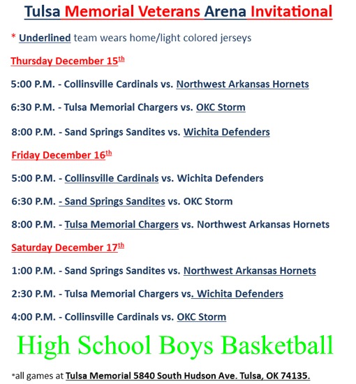 Dec. 15CHS Boys Basketball at Tulsa Memorial Tournament 5pm Collinsville -vs- Northwest Arkansas 5pm JrHi Basketball at Coweta 7pm Band Winter Concert (at CHS) |