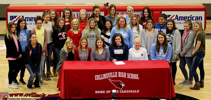 | Collinsville High School Senior Megan Rice signed to play volleyball with Randall University Friday Dec. 2, 2016. The Moore, OK, university had been Hillsdale Free Will Baptist College until a name change July 1, 2016. Megan was joined at the signing by (L-R seated): Skip Smith (step-Dad), Tracy Smith (Mom), Megan Rice, and Ed Rice (Dad). (L-R Standing): Kaleigh Reeder (cousin), Tony Reeder (uncle), and Billie Reeder (aunt). | |||||