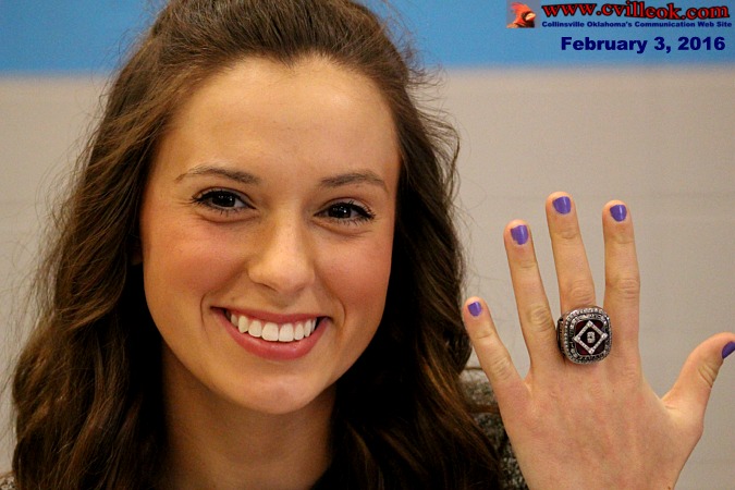 | A BIG RING -- for a big accomplishment! The Collinsville 5A State Champion Softball team members received their rings yesterday. Gail Young, who pitched a 12-inning gem in the finals back in October, proudly displays her new ring. -- 2/3/2016 | ||||