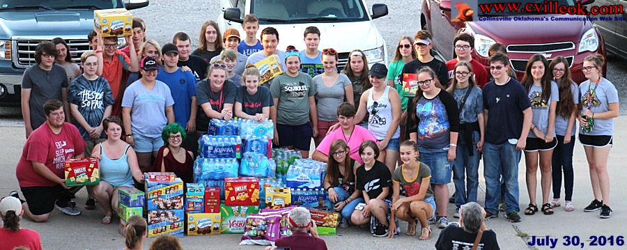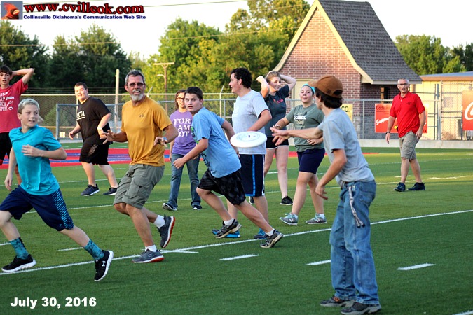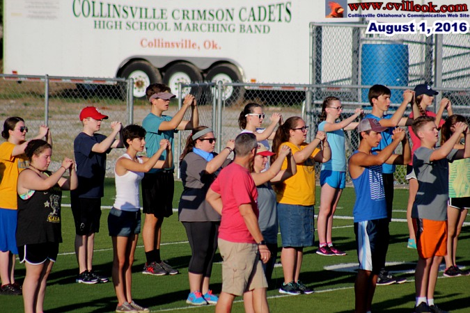 | Last June (2015) the Collinsville Crimson Cadet Band gathered to "Meet the Directors". This year (2016) they already know their directors well, but had a similar looking informal activity to provide information to the students and parents on the upcoming marching season. Mr. Mackey says the program will have a "Spanish" theme but has not been titled yet. The band boosters reported thay they had "paid for" 4 new band uniforms with the annual garage sale earlier that day. The band also collected bottled water and snacks to help keep the band members hydrated and fed at all of the footbal games and marching contests. They got a start on that stockpile (see photo above) but need much more for the expanding band (not all were present in this photo). They ended the evening with an "Ultimate Frisbee" competition. | ||||